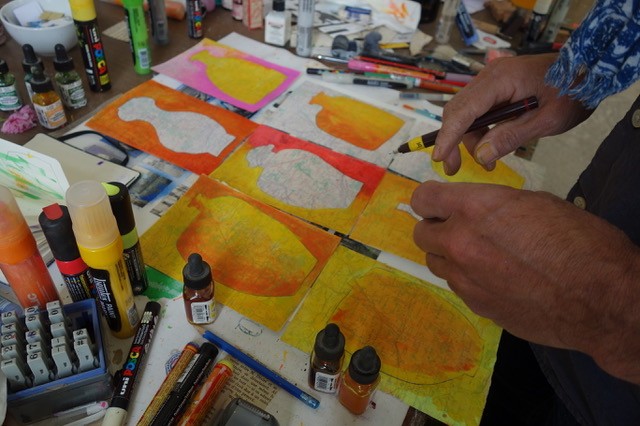 Le travail de Dan Walker est fait d’oeuvres sur papier colorées et graphiques où matériaux de récup, archives, anciens tampons, textiles ont la part belle.